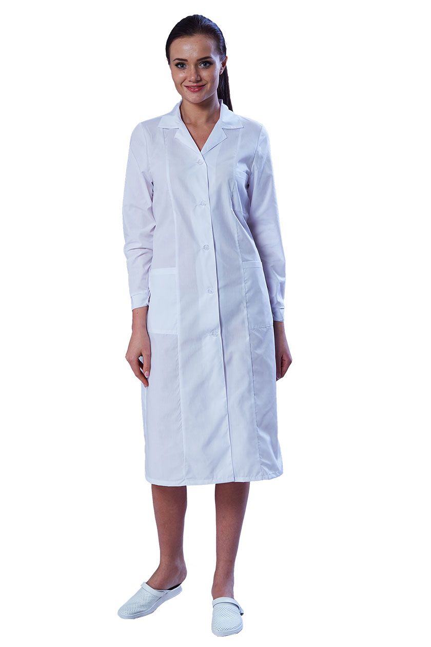 Халат с центральной бортовой застежкой на пуговицы. С одним нагрудным накладным и двумя нижними карманами. Женский халат с рельефными швами. Спинка со средним швом, с поясом, втачанным в боковые швы.