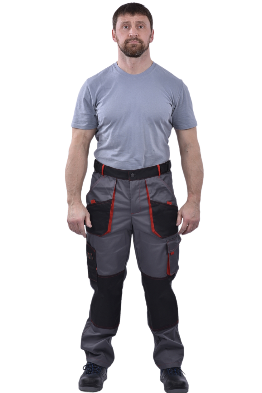 Брюки мужские с застежкой гульфика на тесьму «молния» и притачным поясом с красными шлевками. Передние половинки брюк с 2 боковыми накладными карманами с наклонным входом. На левой половинке в области колена дополнительный карман.