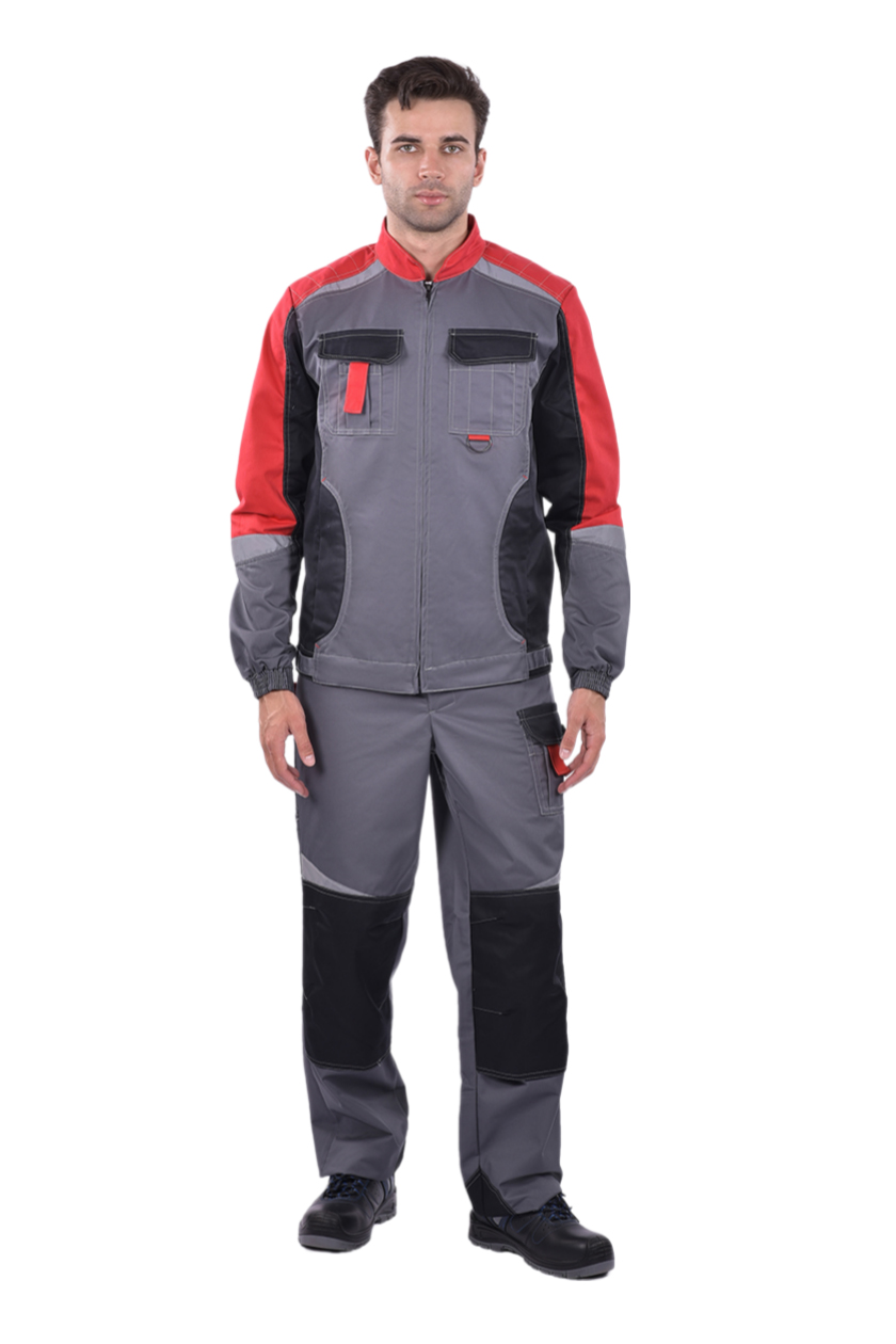➠ Полукомбинезон: в правом боковом шве застежка на пуговицу, в среднем шве на «молнию», карман с клапаном на грудке, боковые карманы с отрезным бочком. Колени усилены накладками, заложены по 2 вытачки. Один карман над левым наколенником. По шву наколенников косые, фигурные вставки СОП.